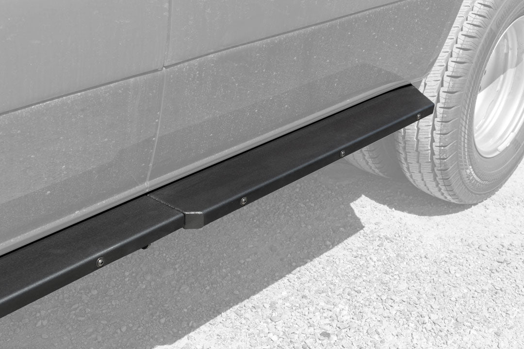 More than just a step! Add functional protection, chassis rigidity and ease of access to your 170" wheelbase AWD Sprinter in sleek style with a set of Van Compass Rocker Guards. Our signature stealth design cues create an attractive 4" wide step to make getting in and out of your van more convenient, and the rear portion features an additional 1" of width for additional protection on tight trails. This robust design offers excellent body protection and adds easy to access vehicle lifting points. Integrated Hi-Lift jack slots make off-road recovery or flat tire changes go quickly and safely.